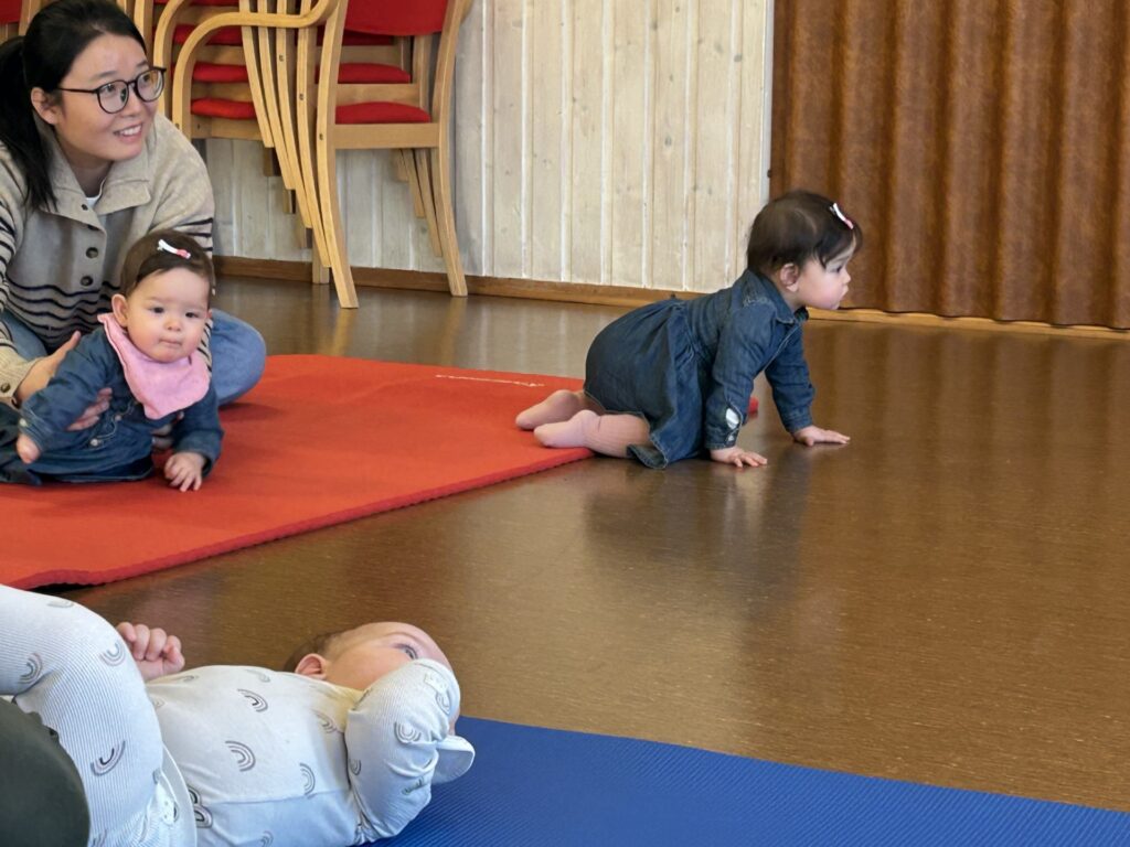 Då vi er på besøk kjem ungane inn i rommet litt pø om pø. Først vesle Hanna Sofie Ybanez på åtte månadar. Deretter Leander Førde som er ein månad eldre. Til sist kjem tvillingane Heidi og Elsa Wang-Gulestøl inn døra for å ta plass mellom dei andre. Ja, dei kjem ikkje åleine, men i følgje med mødrene sine.